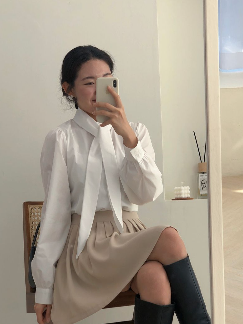 타이 리본 봄 코튼 바스락 레어이드 이너 블라우스