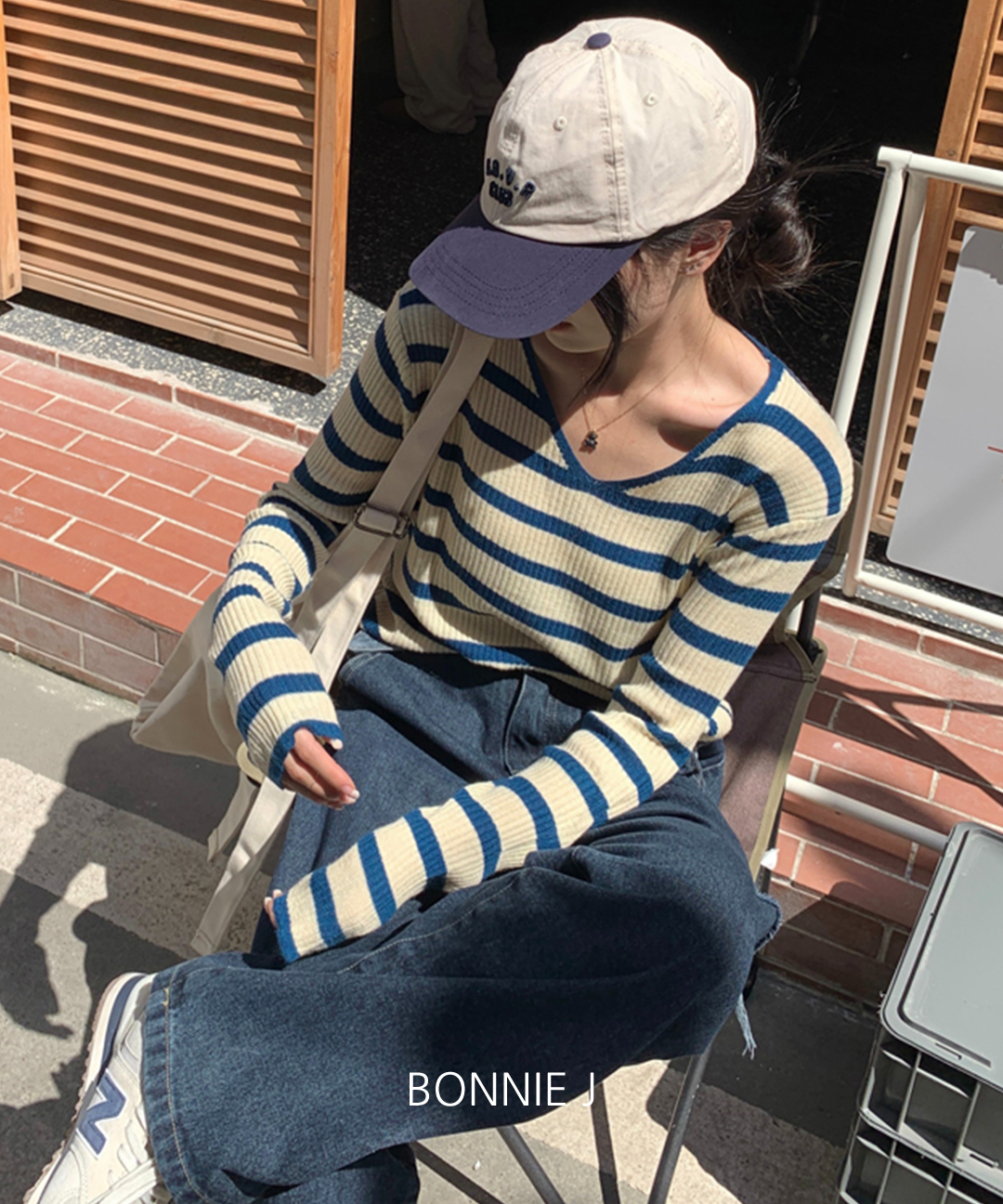 슬림라인 스트라이프 브이넥 골지 니트 티셔츠