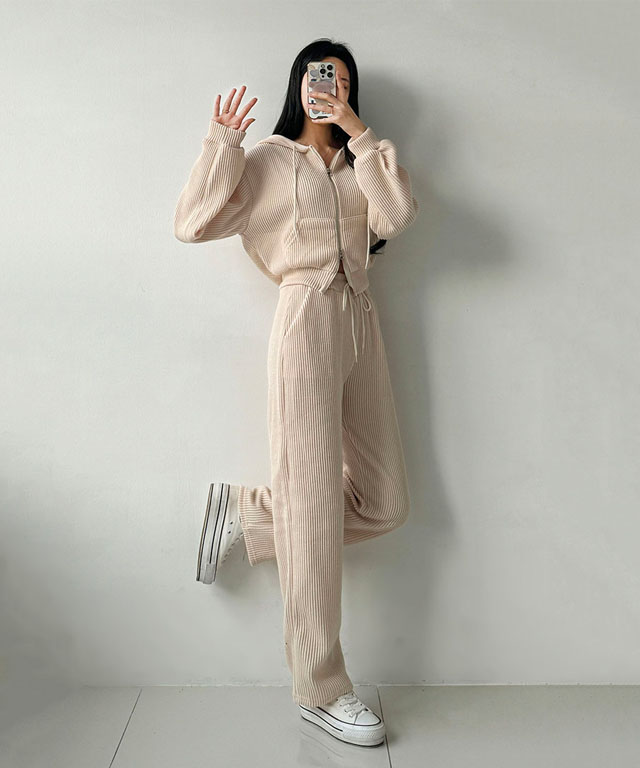 [키작녀/봄가을겨울ver./정말편해요!] 젤리 아방핏 골지 니트 투웨이 후드 집업 와이드 밴딩 팬츠 세트 셋업 투피스 트레이닝복 봄신상 봄 가을 간절기