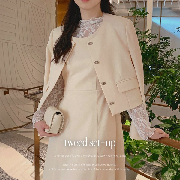 [하객룩♥][고급스러움set][MADE] 페리엇 트위드 노카라 크롭자켓+슬리브리스 플레어 롱원피스 set(44~100) (데이트룩-하객룩-하객룩셋업-격식룩-라운드넥자켓-나시원피스-빅사이즈투피스-빅사이즈셋업-봄셋업-가을하객룩)