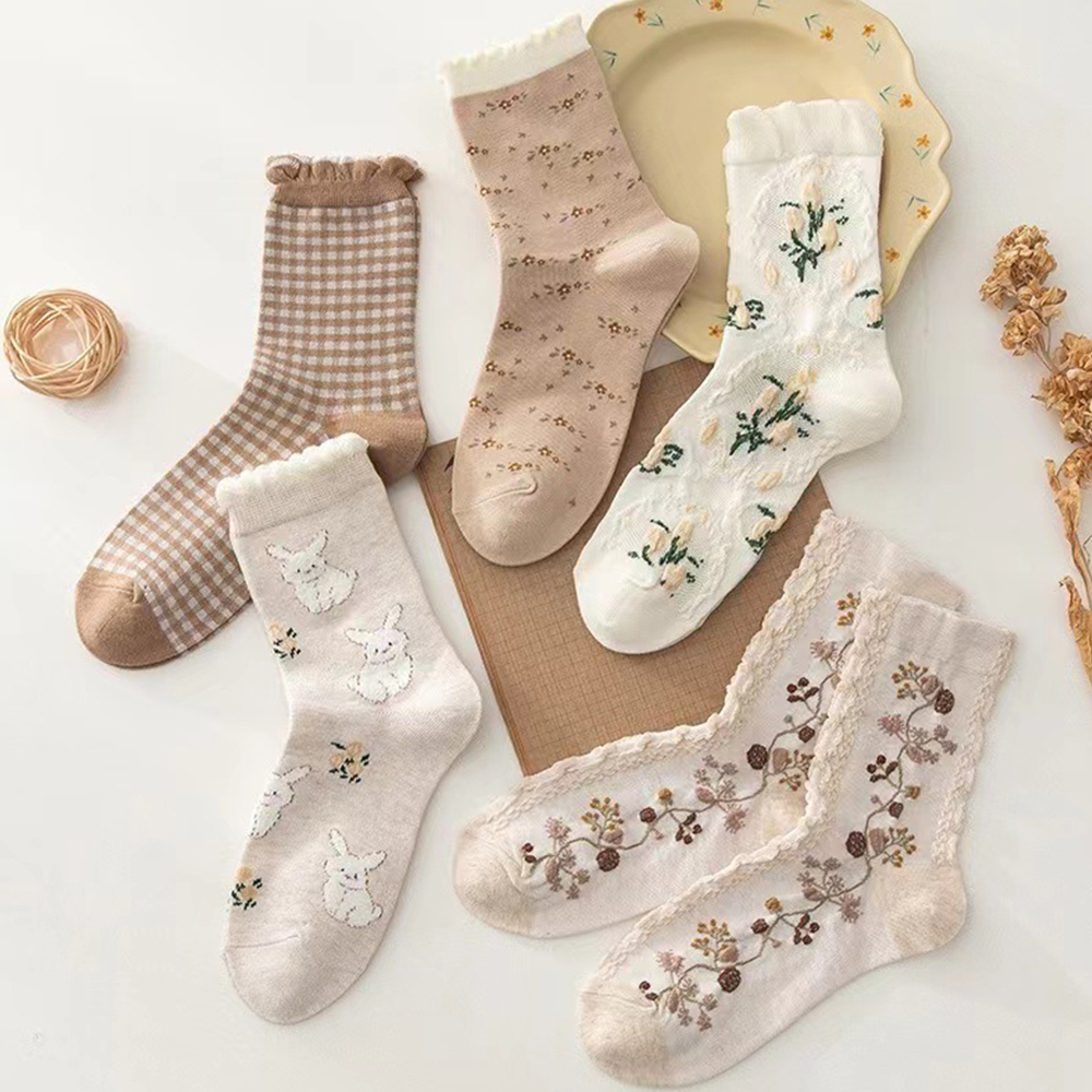 [블랑블랑]여성 브라운 베이지 큐트 중목 양말 5개 세트 NC-008