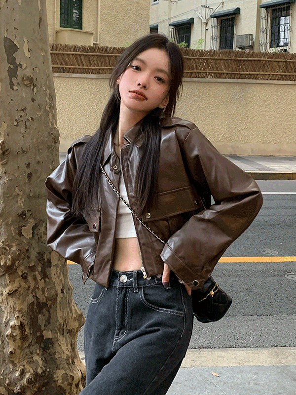 [얼리어텀/시크무드🤎] 트래픽 싱글 카라 레더 바이크 숏 자켓
