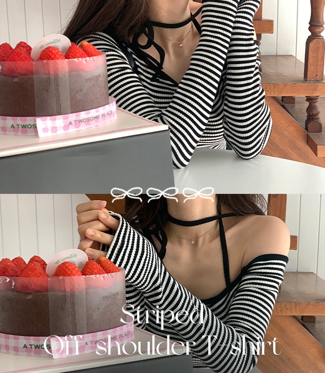 아이린 언발 오프숄더티셔츠(3color) [봄 긴팔티셔츠 크롭티셔츠 스트라이프 단가라 원오프숄더 슬림핏 줄무늬 단가라 초커 타이 날씬핏 섹시 스트랩 사선트임 리본 트임티셔츠 여리핏 개강룩 데이트룩 러블리 데일리룩]