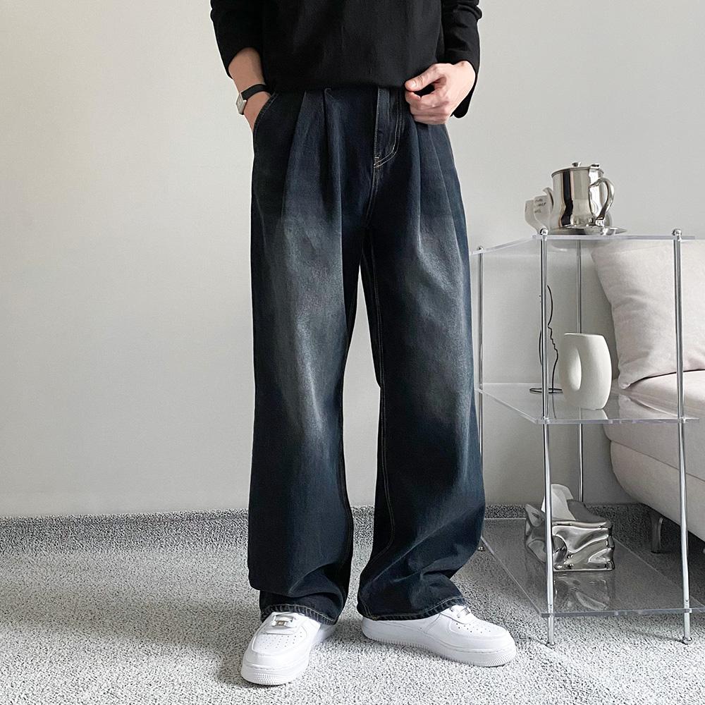 [핏보장]와이드핏 흑청바지 남자 통청바지 블랙진 통큰 워싱 데님 팬츠 청바지