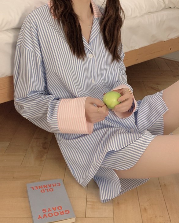(당일발송) 셔츠 배색 스트라이프 잠옷 파자마 긴팔 반바지 봄 여름 잠옷 홈웨어 세트
