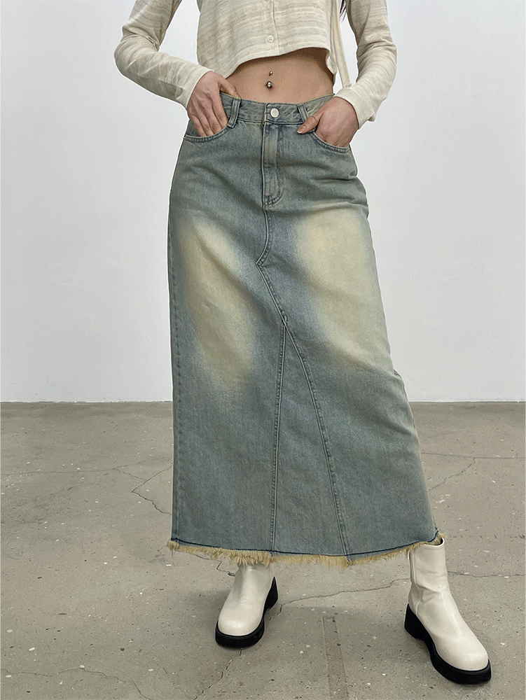 플래트 밑단 수술 뒷트임 데님 롱스커트