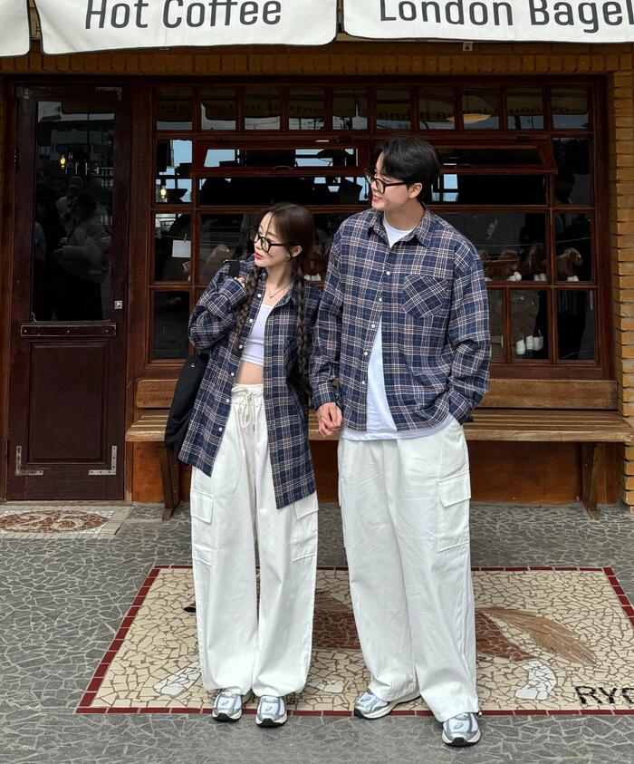 *여름까지[3컬러/세트가능]남녀공용 체크 셔츠 오버핏 남방 커플룩 시밀러룩 봄 가을 타탄 체크남방 시밀러룩 꾸안꾸 데일리 캠퍼스룩 와이드 코튼 카고팬츠 세트 초특가
