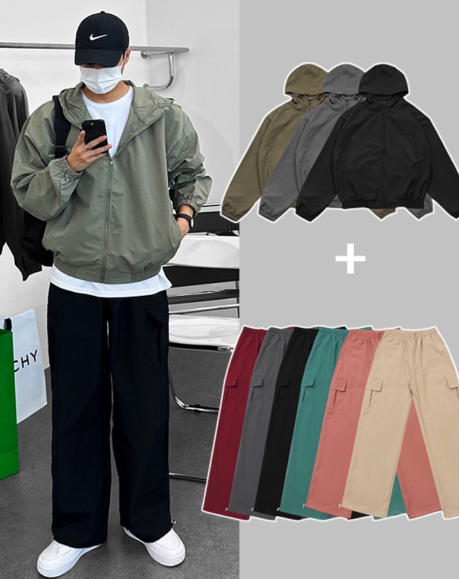 (SET) 남녀공용 바람막이+카고와이드팬츠 세트 카고팬츠 카고와이드 후드집업 윈드브레이커 야상 남자바지 아노락세트 남자아노락