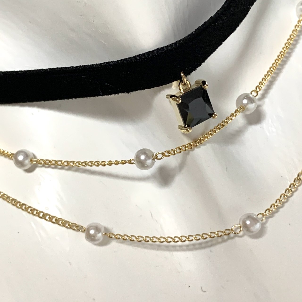 진추 초커 레이어드 3줄 3겹 쵸커 검정초커 검정끈 목걸이 진주장식 벨벳 여러줄 여러겹
