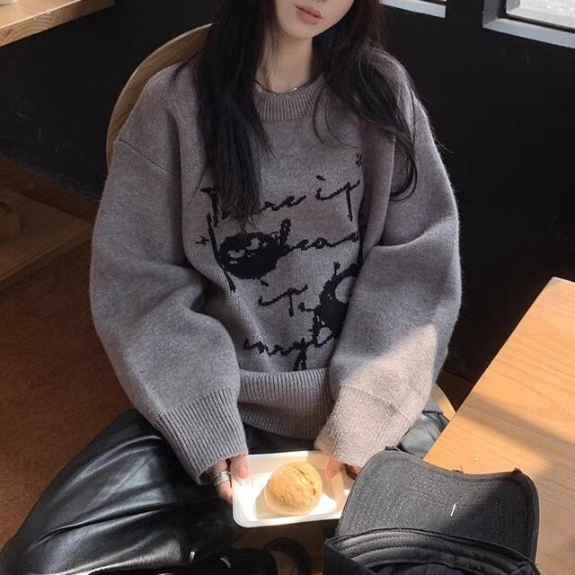 [당일발송/그레이] 귀여운 레터링 캐릭터 라운드넥 긴팔 니트 스웨터 2color 데일리룩 캐주얼룩 여행룩 여친룩 나들이룩 레이어드룩 스트릿