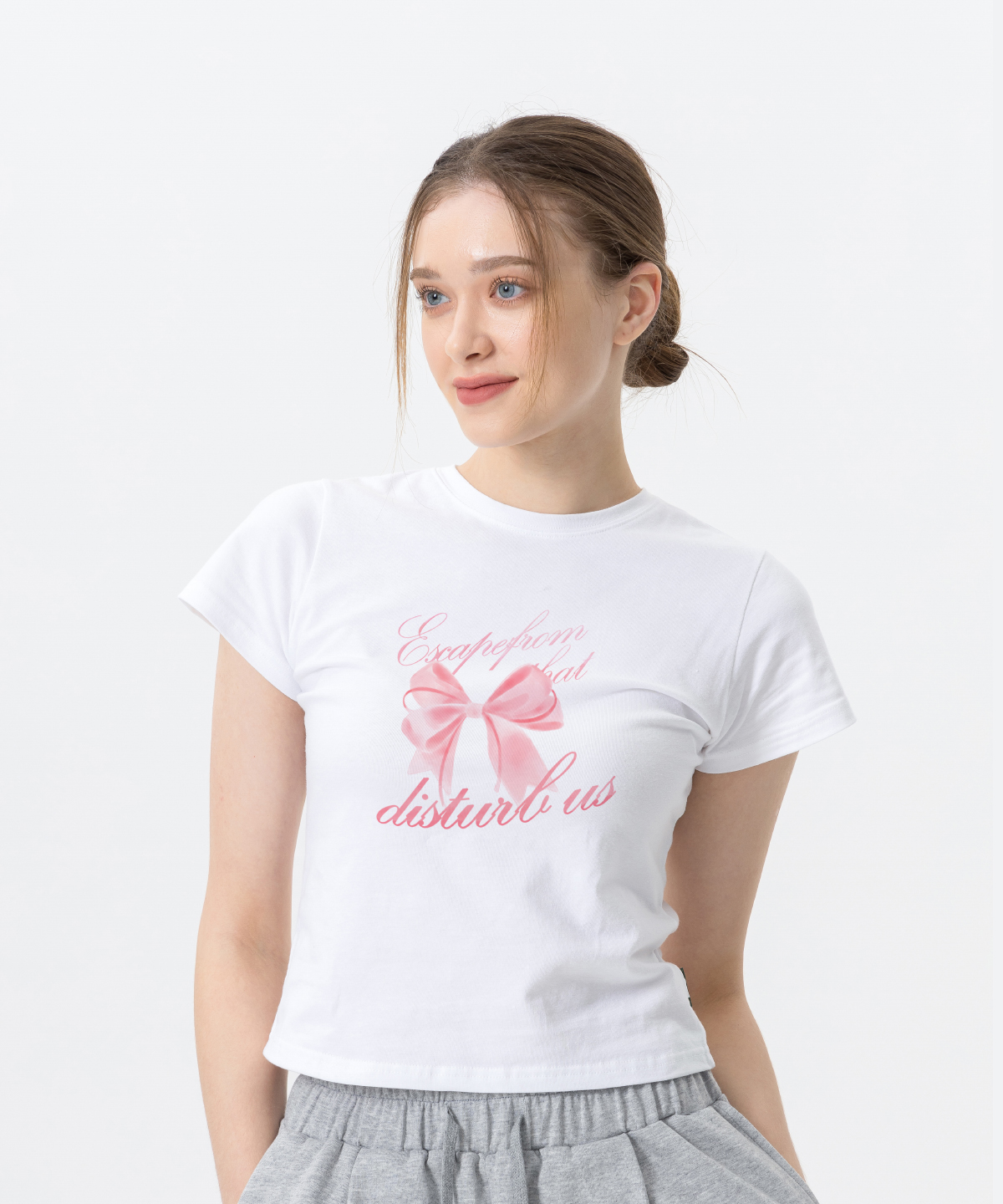 핑크 리본 일러스트 프린트 슬림핏 반팔티 화이트