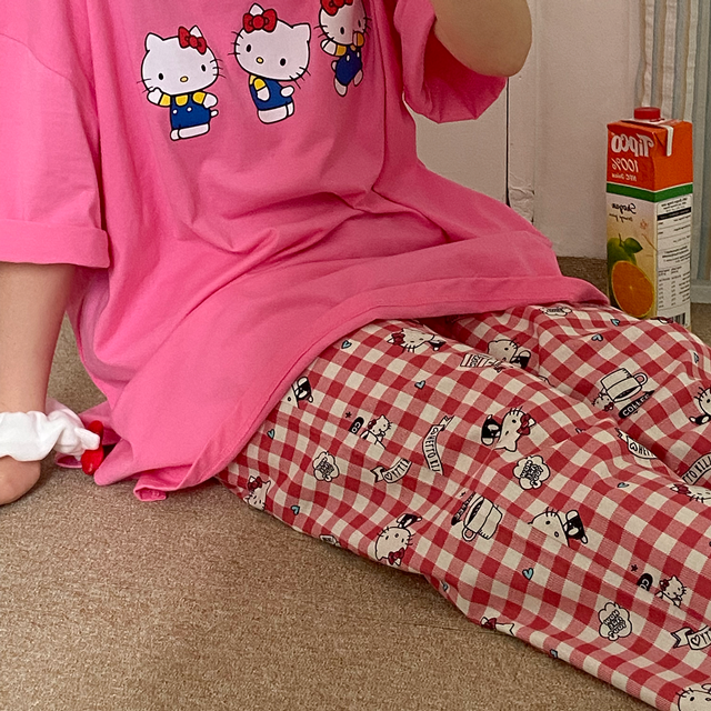 산리오 헬로키티 잠옷 바지 순면 체크 키티 잠옷 바지 파자마 파티
