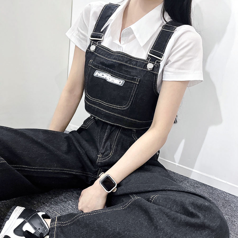 [S~M]Y2K 데님 크롭 탑 숏 멜빵 뷔스티에 포켓 루즈핏 레터링 로고 패치 버튼 나시 스티치 하이웨스트 와이드 롱 팬츠 투피스 세트 캐주얼 빈티지 점프수트 꾸안꾸 키치