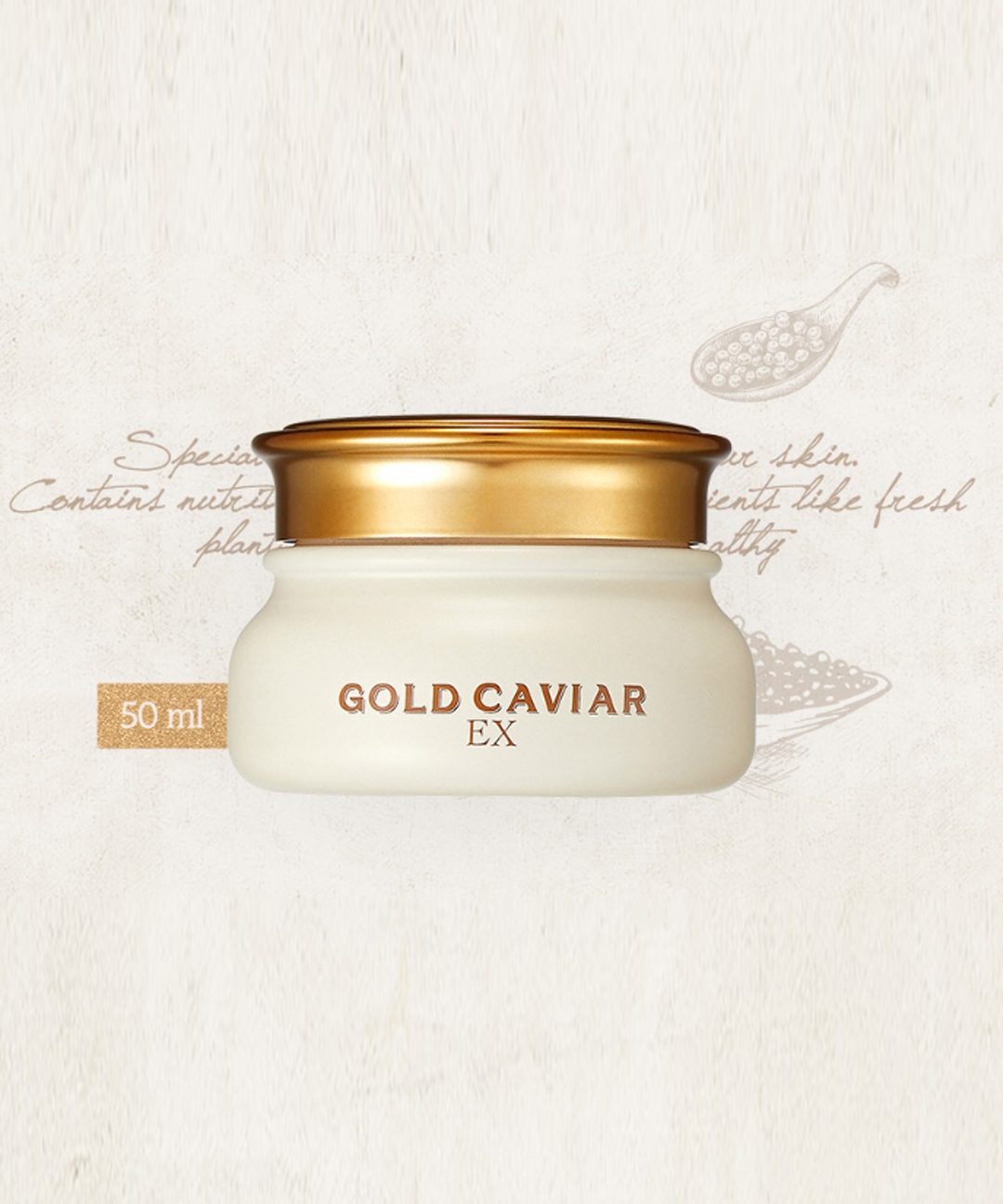 화장품법에 따라 기재, 표시하여야 하는 모든 성분정제수, 시어버터, 글리세린, 세테아릴알코올, 다이프로필렌글라이콜, 사이클로헥사실록세인, 글리세릴스테아레이트, 세테아릴올리베이트, 아이소프로필미리스테이트, 카프릴릭/카프릭트라이글리세라이드, 트라이에틸헥사노인, 솔비탄올리베이트, 1,2-헥산다이올, C12-16알코올, 판테놀, 에틸헥실글리세린, 하이드로제네이티드레시틴, 부틸렌글라이콜, 다이펜타에리스리틸헥사하이드록시스테아레이트/헥사스테아레이트/헥사로지네이트, 팔미틱애씨드, 세테아릴글루코사이드, 카보머, 하이드록시에틸아크릴레이트/소듐아크릴로일다이메틸타우레이트코폴리머, 트로메타민, 아데노신, 인도멀구슬나무잎추출물, 펜틸렌글라이콜, 인도멀구슬나무꽃추출물, 캐비아추출물(200 ppm), 소듐파이테이트, 울금뿌리추출물, 리놀레닉애씨드, 리놀레익애씨드, 효모추출물, 솔비탄아이소스테아레이트, 소듐하이알루로네이트, 수크로오스팔미테이트, 잇꽃씨오일, 멕시칸치아씨오일, 폴리글리세릴-10라우레이트, 폴리글리세릴-10올리에이트, 금콜로이드(50 ppm), 글루코오스, 홀리바질잎추출물, 참산호말추출물, 아세틸헥사펩타이드-8, 팔미토일펜타펩타이드-4, 카프릴릴글라이콜, 향료