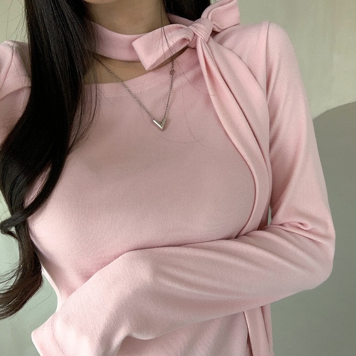 [봄신상ෆ발레코어/가격실화?] 비브 리본 스트랩 오픈 홀터넥 스카프 언발 긴팔 티셔츠 몸매보정 여리핏 슬림핏 오프숄더 스카프 y2k 발레코어 입문템 데이트룩 러블리