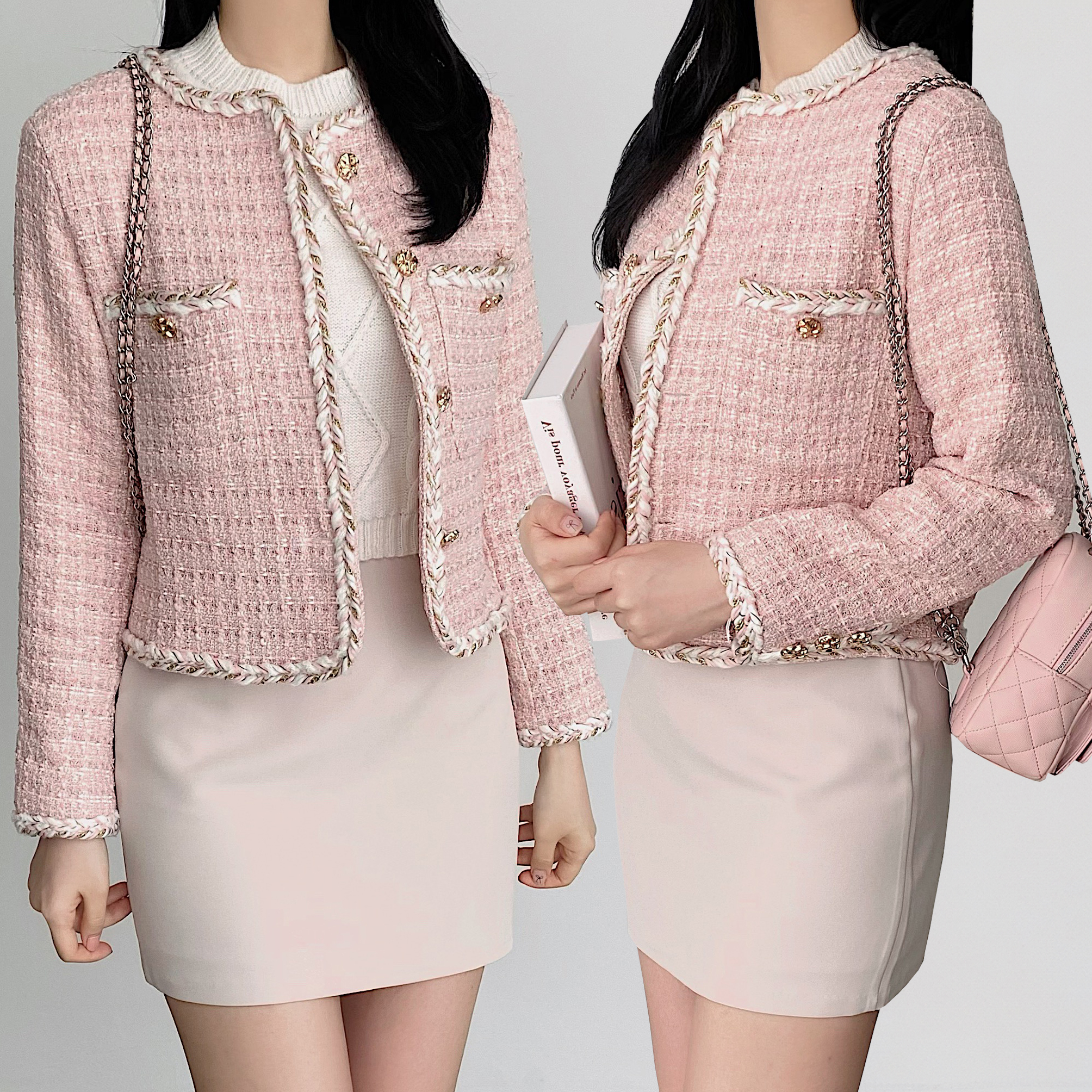 핑크트위드 핑크트위드자켓 봄트위드자켓 노카라트위드자켓 크롭트위드자켓 핑크자켓 핑크 트위드 봄 노카라 크롭 자켓