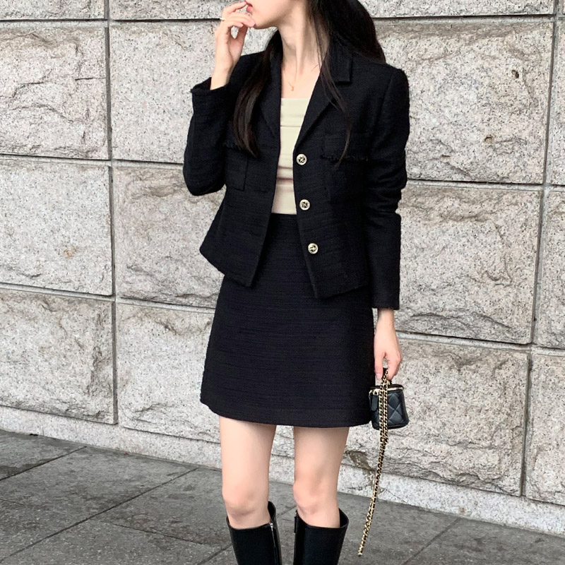 (트위드셋업)1000장 돌파✨ 리빗 수술 트위드 자켓 스커트 셋업 하객룩 오피스룩정장 하객룩원피스 트위드카라 면접원피스 셋업하객룩 나들이룩 트위드자켓 st2561
