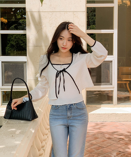 [단독][⭐5천장/소매2TYPE][44-66]MADE 로엘 리본 주름지 나시 퍼프 가디건 세트(긴팔/반팔)