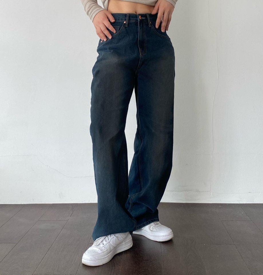 페인팅진🌱 특이한 더티워싱 와이드 하이웨스트 진청 데님 통넓은 빈티지워싱 봄신상 하비 청 바지