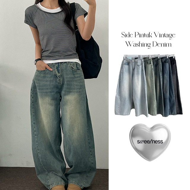 기장수선NO! [숏&롱/S-XL] 힙한핏 사이드 절개 핀턱 빈티지 워싱 와이드 벌룬 데님 청바지 팬츠 5color