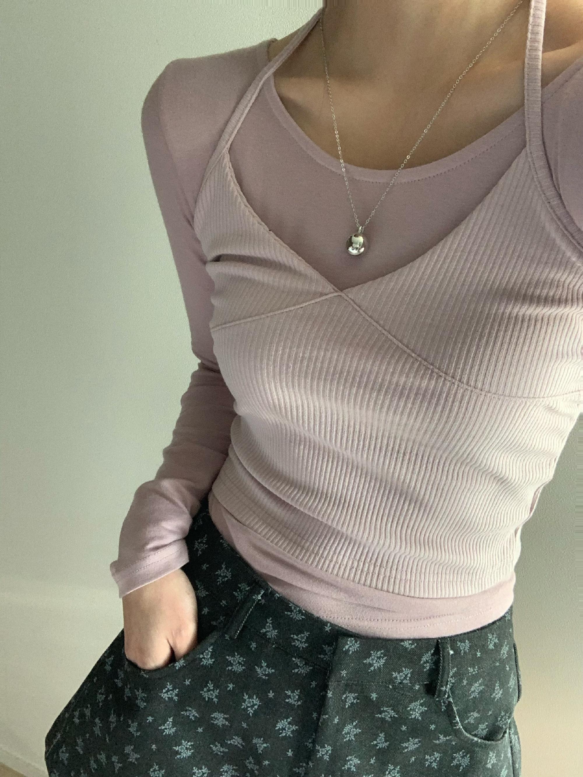 [레이어드set/강추템] 여성 파이 홀터넥 뷔스티에 나시 유넥 긴팔 티셔츠 세트 발레코어룩 레이어드룩 4color