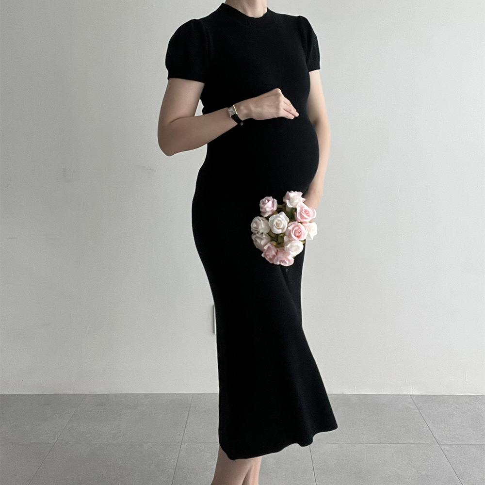 만삭 임산부 주수 촬영 사진 베이비샤워 셀프만삭 어깨퍼프 니트 원피스