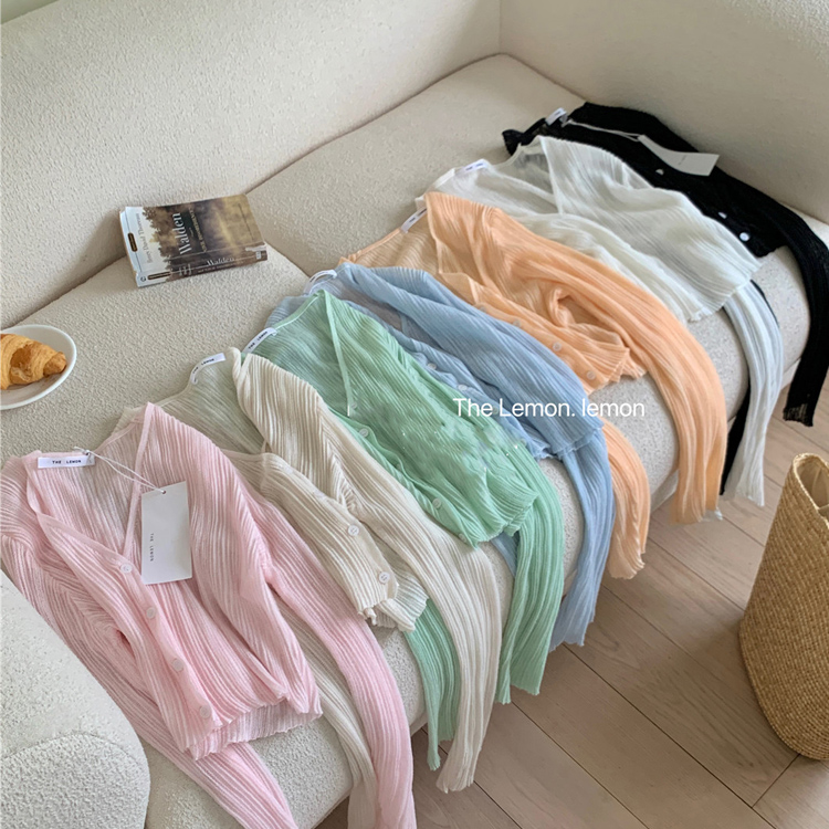 (당일출고) 브이넥 파스텔 플리츠 썸머 여름 주름 긴팔 시스루 슬림핏 얇은 루즈핏 니트바캉스룩 휴가룩 휴양지룩 페스티벌룩 흠뻑쇼 살안타템 장마룩 크롭 가디건 볼레로 5color