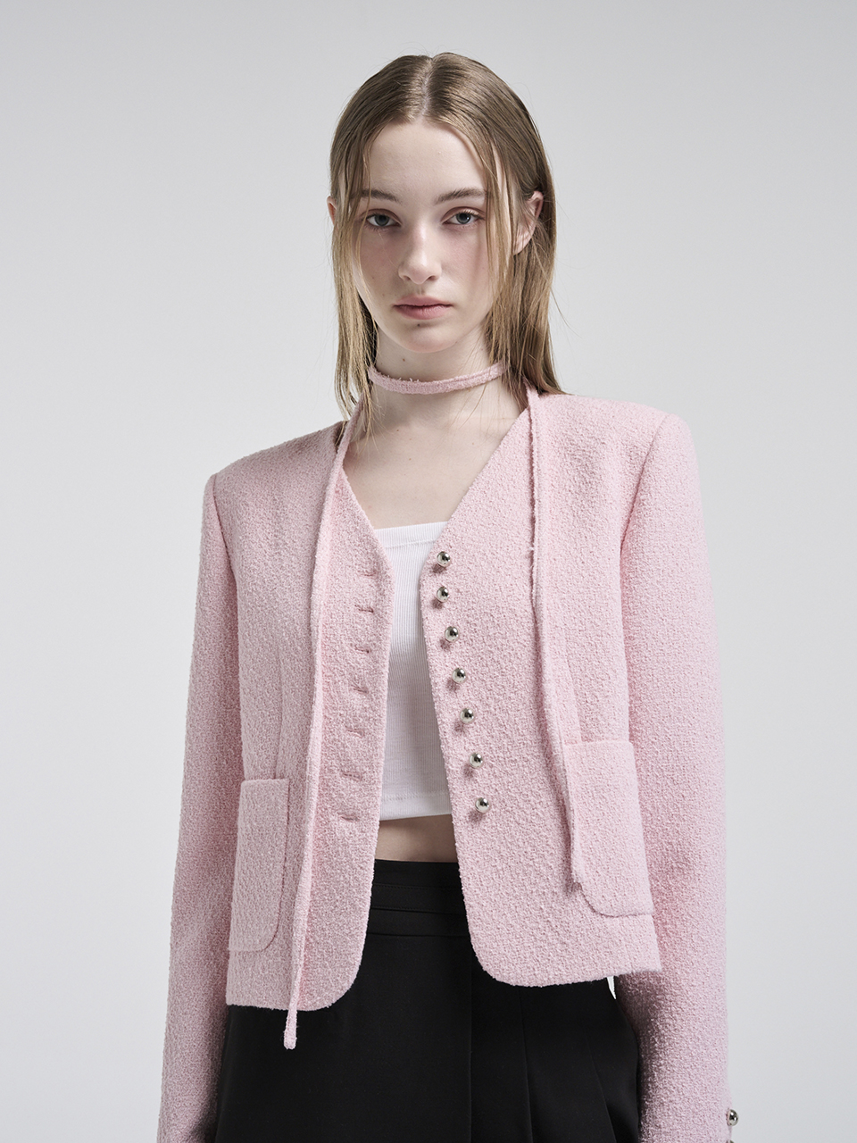 V-Neck Strap Tweed Jacket, Pink