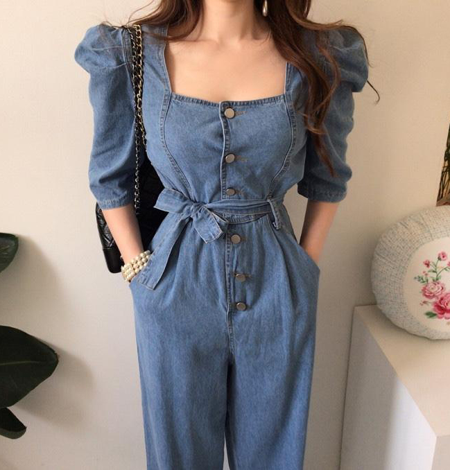 공항패션/셀럽룩 [공항룩] 바캉스 스타일 퍼프 반팔 단추 데님 점프수트