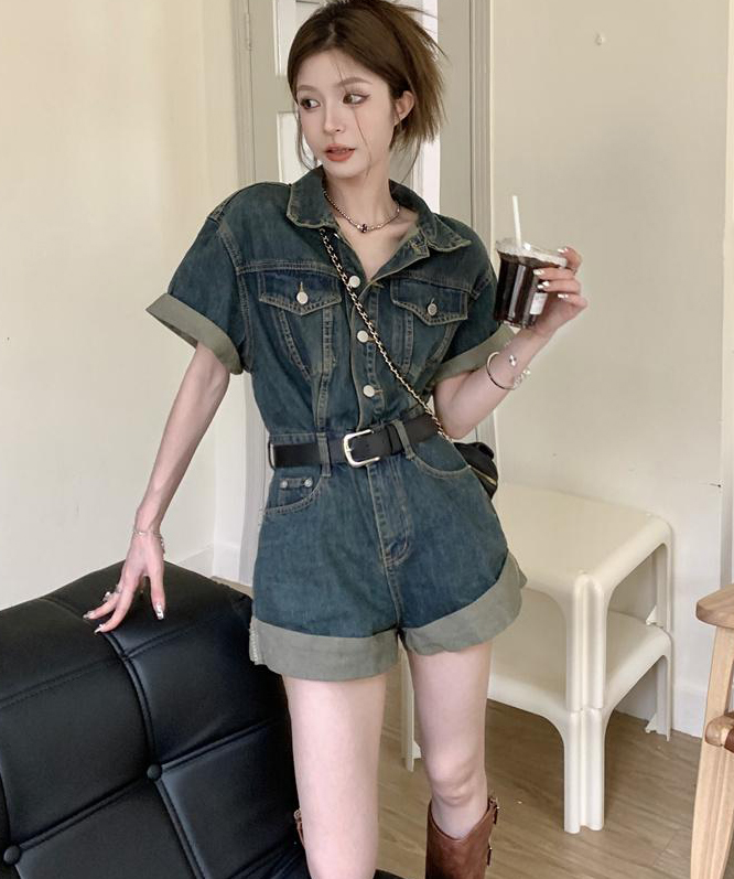 공항룩 [공항패션] 벨티드 롤업 반팔 반바지 데님 점프수트 S~2XL빅사이즈
