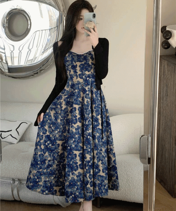 봄 원피스세트 하트넥 뷔스티에 블루 플라워 A라인 롱원피스 원피스가디건세트 플로럴 롱 플레어원피스 데이트룩 봄 나들이 벚꽃놀이 빈티지플라워패턴 롱원피스 빈티지 뷔스티에원피스 뷔스티에롱원피스 가디건세트