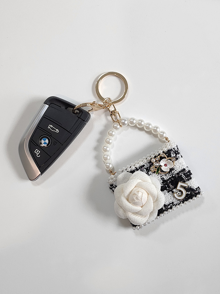 럭셔리 진주 트위드 가방 모양 꽃 참 장식 키홀더 7컬러 키링 477