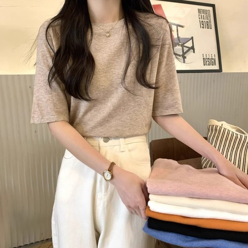브디랑 핑크 반팔니트 봄 여름 가을 블랙 라운드 얇은 니트탑 티셔츠