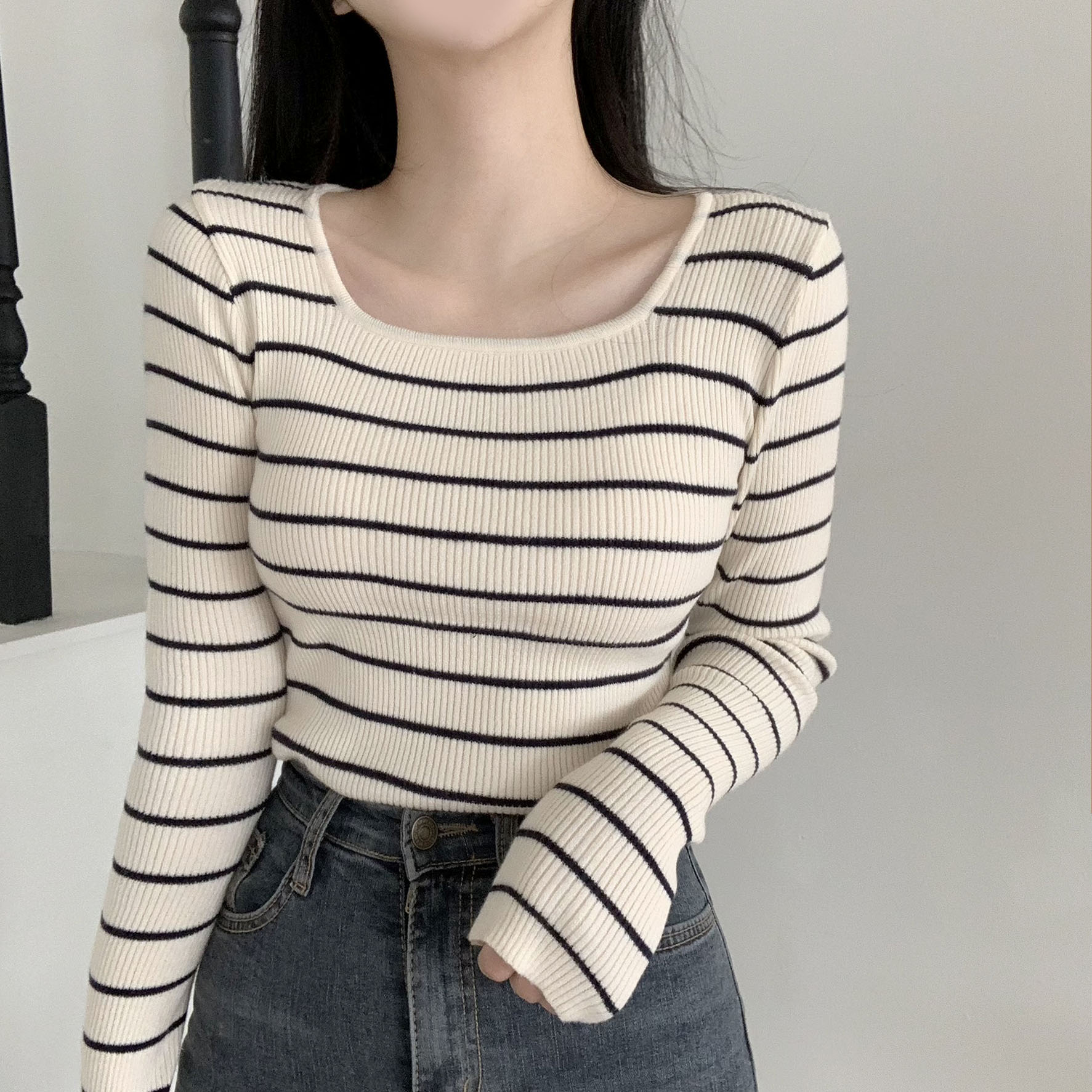 [여리핏]무지/단가라 스퀘어넥 슬림 골지 긴팔니트