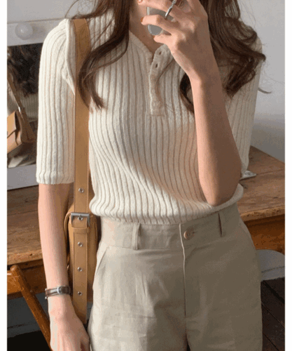 유루> 골지 슬림핏 티셔츠 니트티셔츠 긴반팔 니트티셔츠 브이넥니트티셔츠 데일리룩