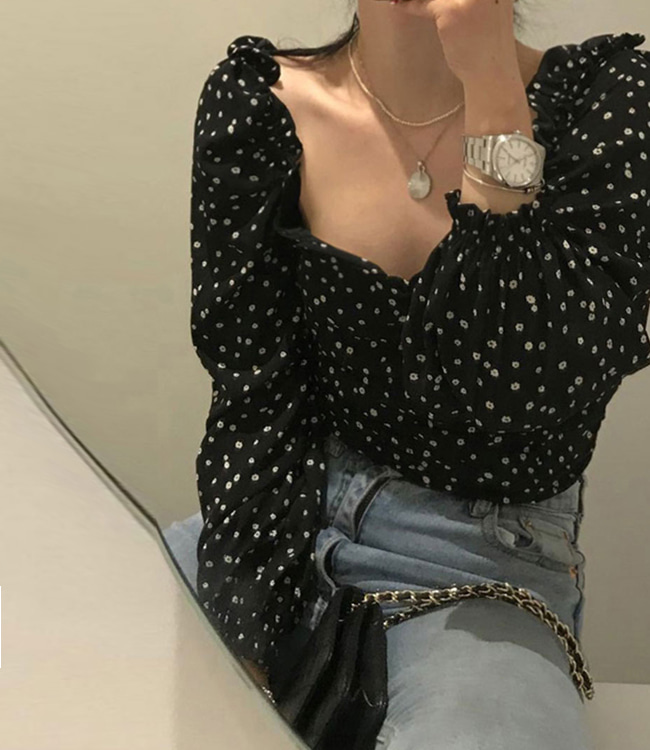 [인기] 간절기룩/데이트룩 뉴트로 하트넥 도트 크롭 긴팔 블라우스