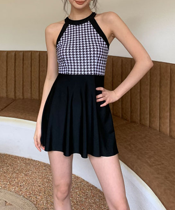 [체크무늬 원피스 수영복] 치마일체형 라운드넥 X자 스트랩 하운드투스 하이웨스트 스커트 수영복 여름휴가 휴양지 바캉스 해변 비치 동남아 신혼여행 스윔웨어