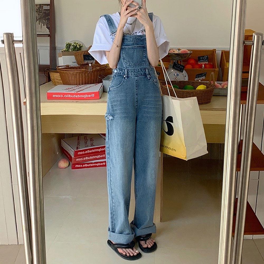 [Best]아리 멜빵 와이드 데님 롱 팬츠