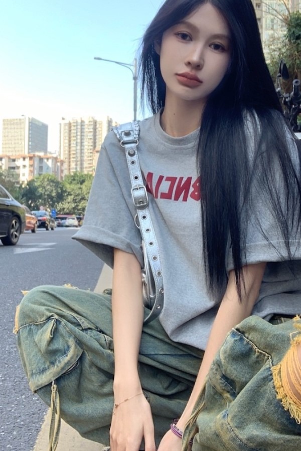 디엔 레터링 프린팅 라운드넥 반팔 루즈핏 티셔츠