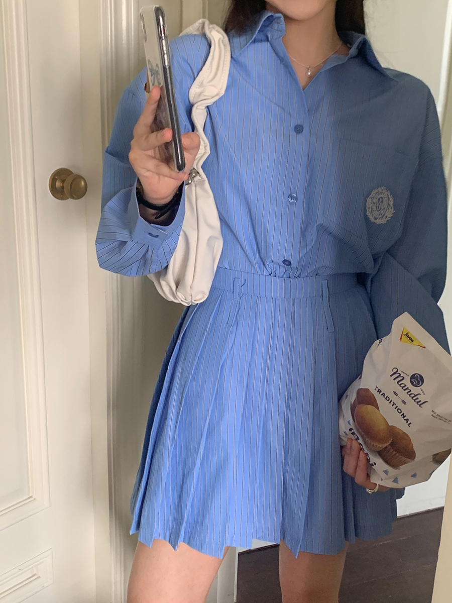 [💙자체제작]시티 스트라이프 셔츠 플리츠 스커트 세트