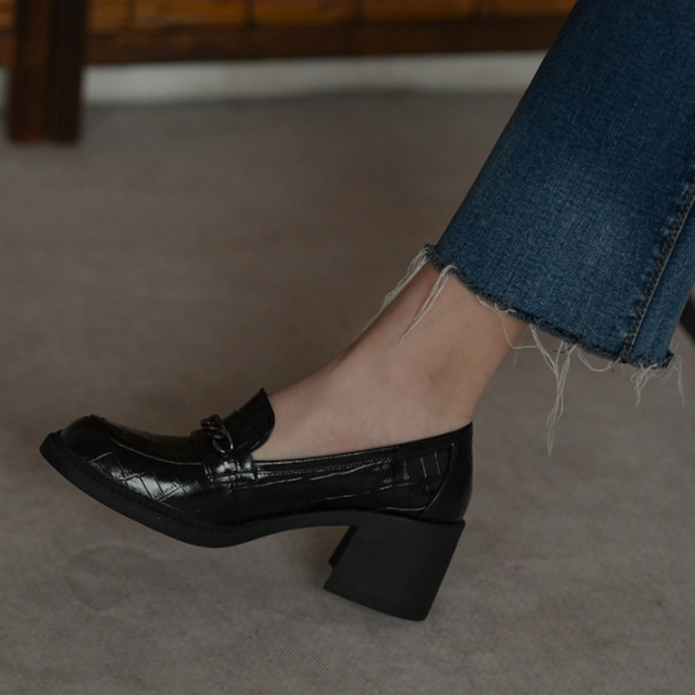 라운드 토 체인 소가죽 크로커다일 패턴 통굽 여성 로퍼