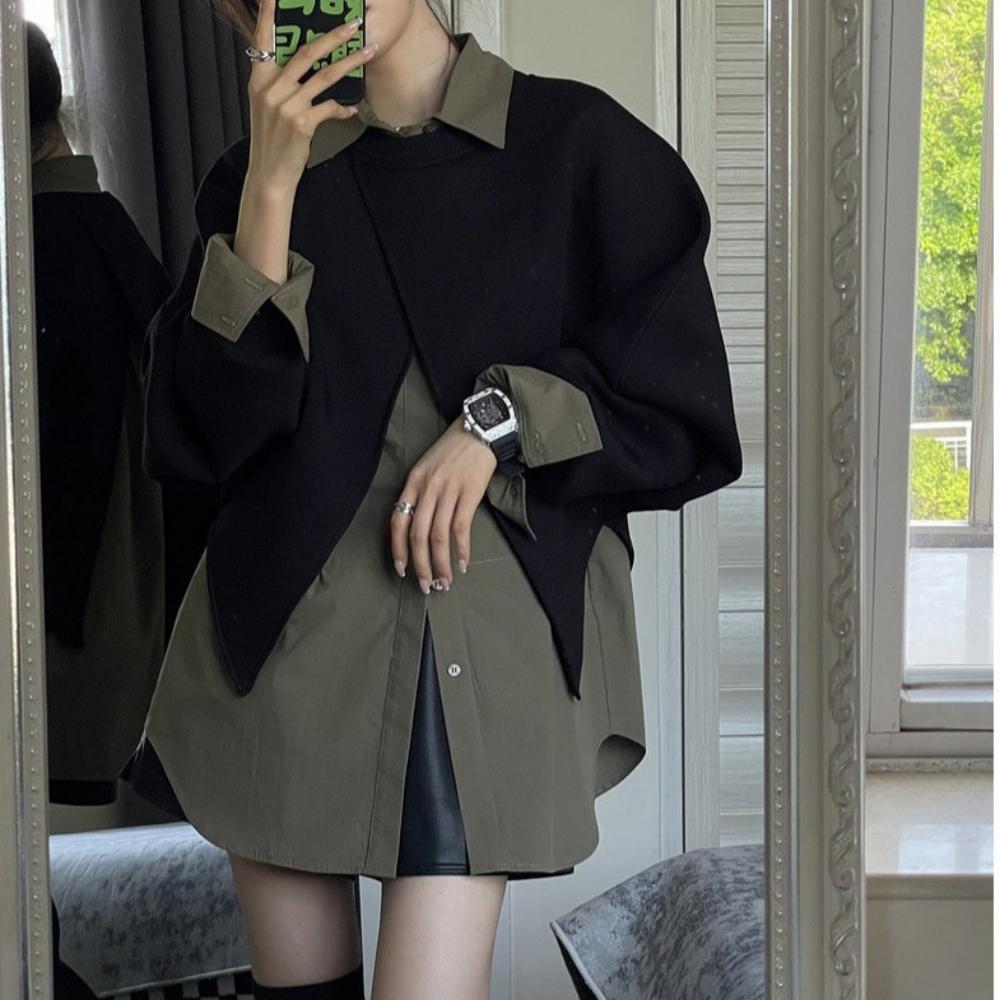 [세트] 오버핏 언발 레이어드 크롭 맨투맨 셔츠 롱 남방 세트