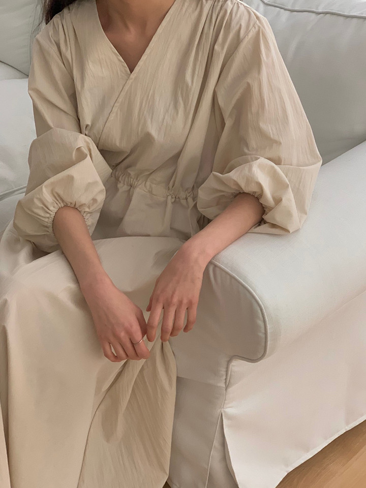 가을원피스/하객룩 나미 랩 브이넥 스트링 벌룬 루즈핏 롱 원피스