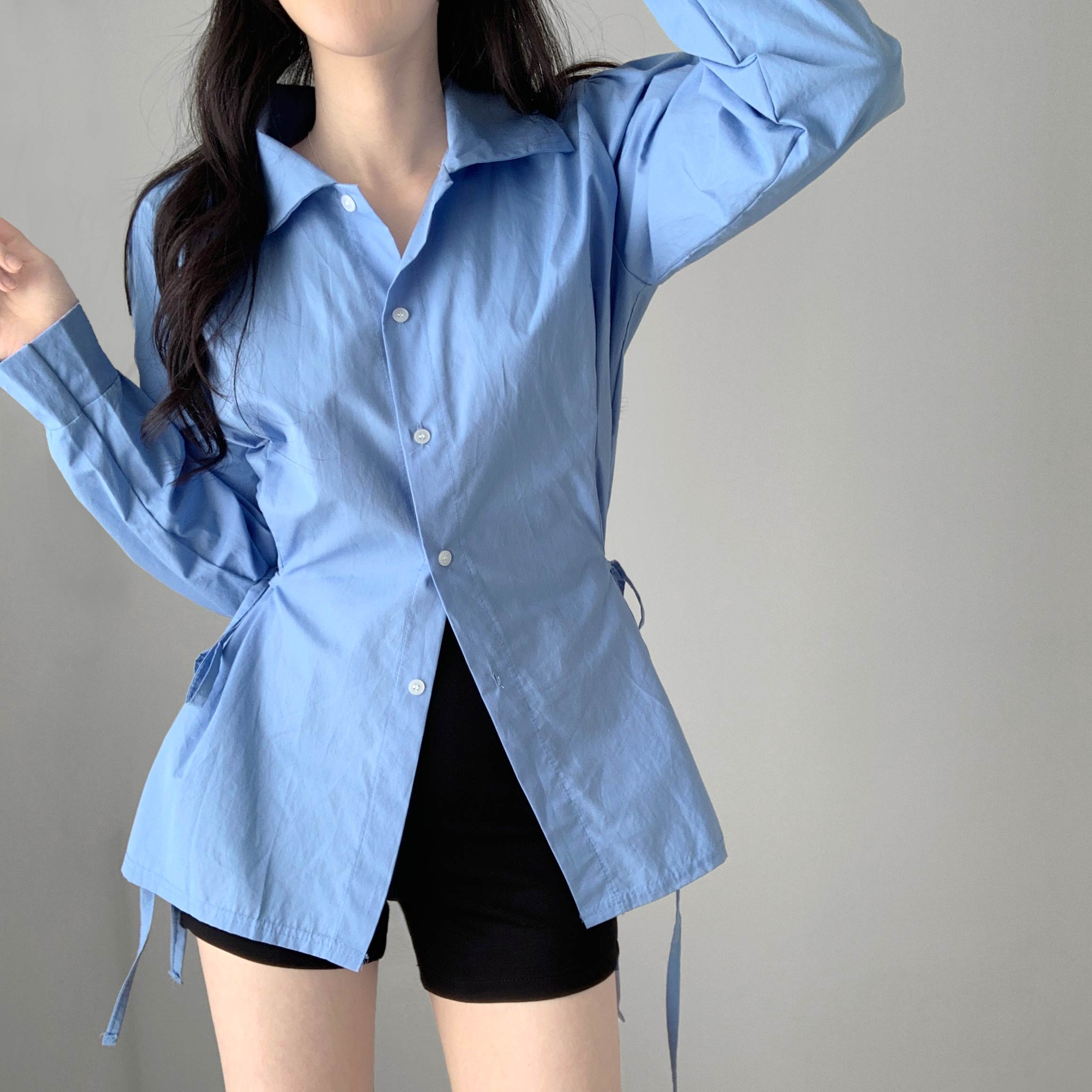 [여리핏💕/레이어드템!] 에일린 리본 카라 버튼 롱 셔츠 남방 블라우스