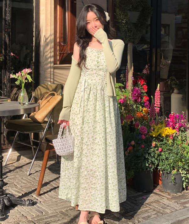 [당일배송] 공항패션 공항룩 휴가 여행룩 그린 꽃무늬 나시 원피스/살안타템 긴팔 팔뚝커버 골지 니트 가디건 여름 코디세트