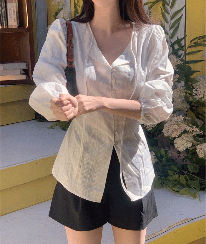 칸토 버튼 스트랩 리본끈 퍼프 롱 블라우스