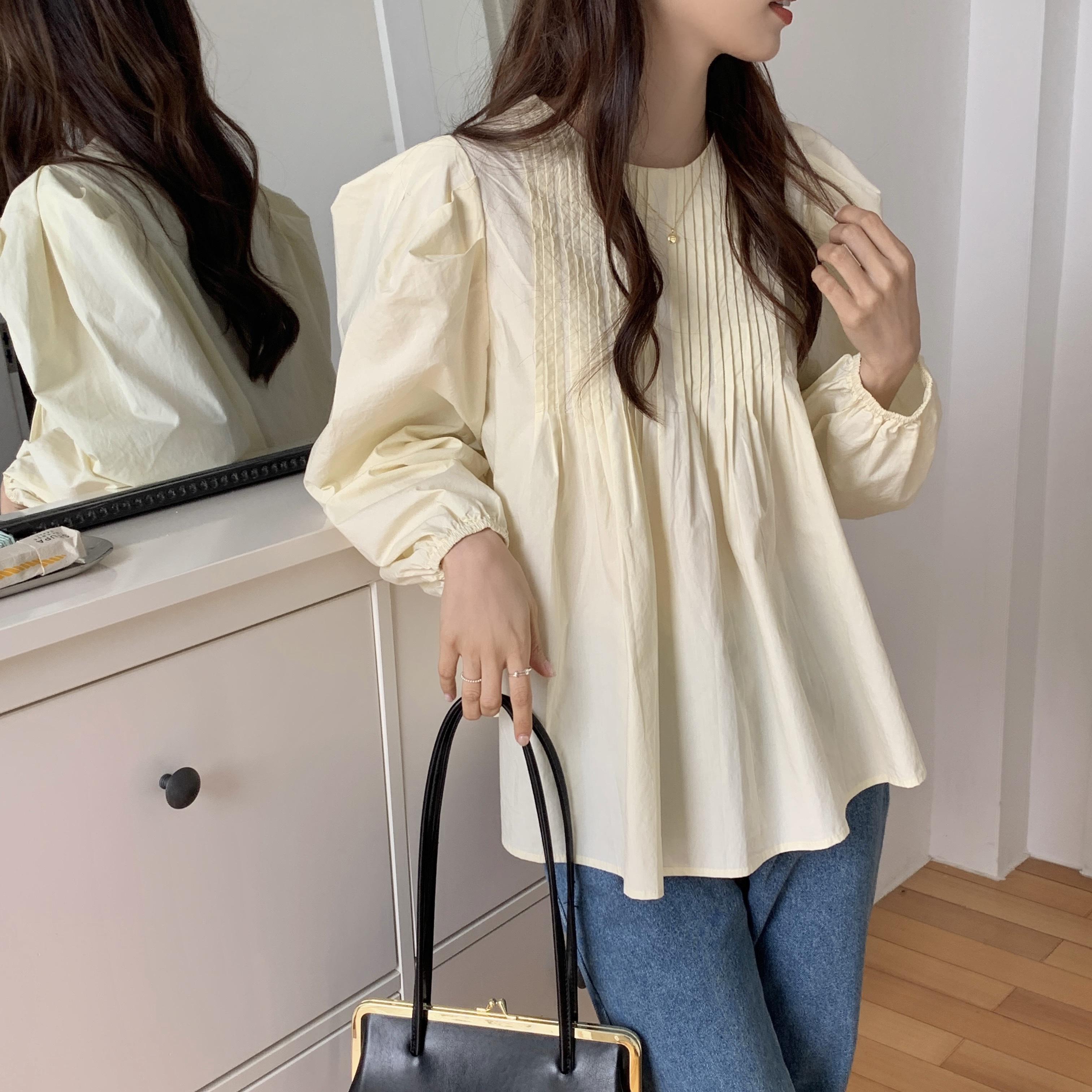 [당일출고] 타마이 핀턱 셔링 퍼프블라우스 봄 가을 빅사이즈 루즈핏 벌룬 블라우스