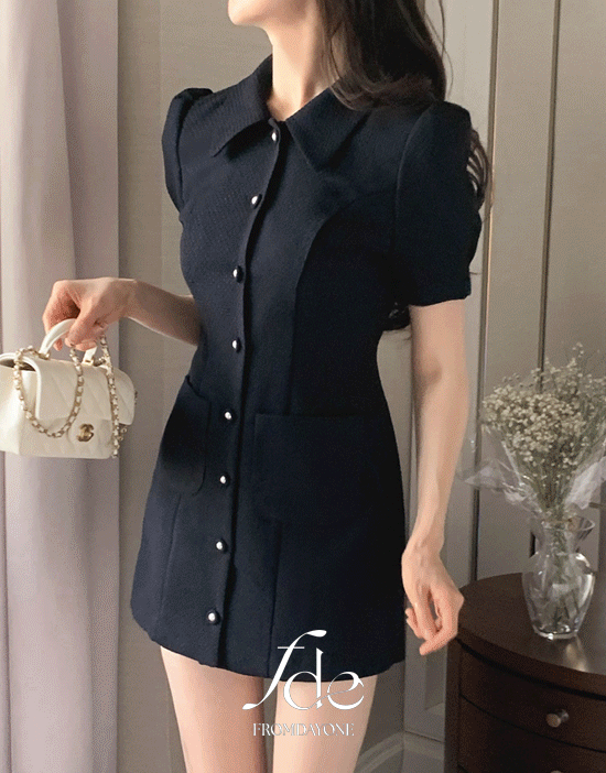 하객룩🖤Made)베라 네이비 트위드 미니원피스(+5cm기장추가/카라/퍼프/진주/포켓/격식룩/하객룩/데이트룩)