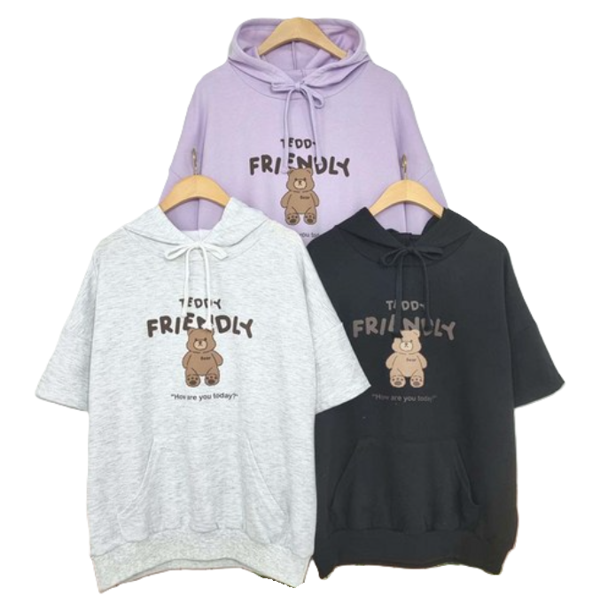 [3컬러] 테디반팔후드티 여성반팔후드티 여자반팔후드티 귀여운후드티 귀요미후드티 중고등학생 학생후드티 여름후드티 반팔티셔츠 후드티셔츠 베어후드티 반팔 후드 여름 10대후드티