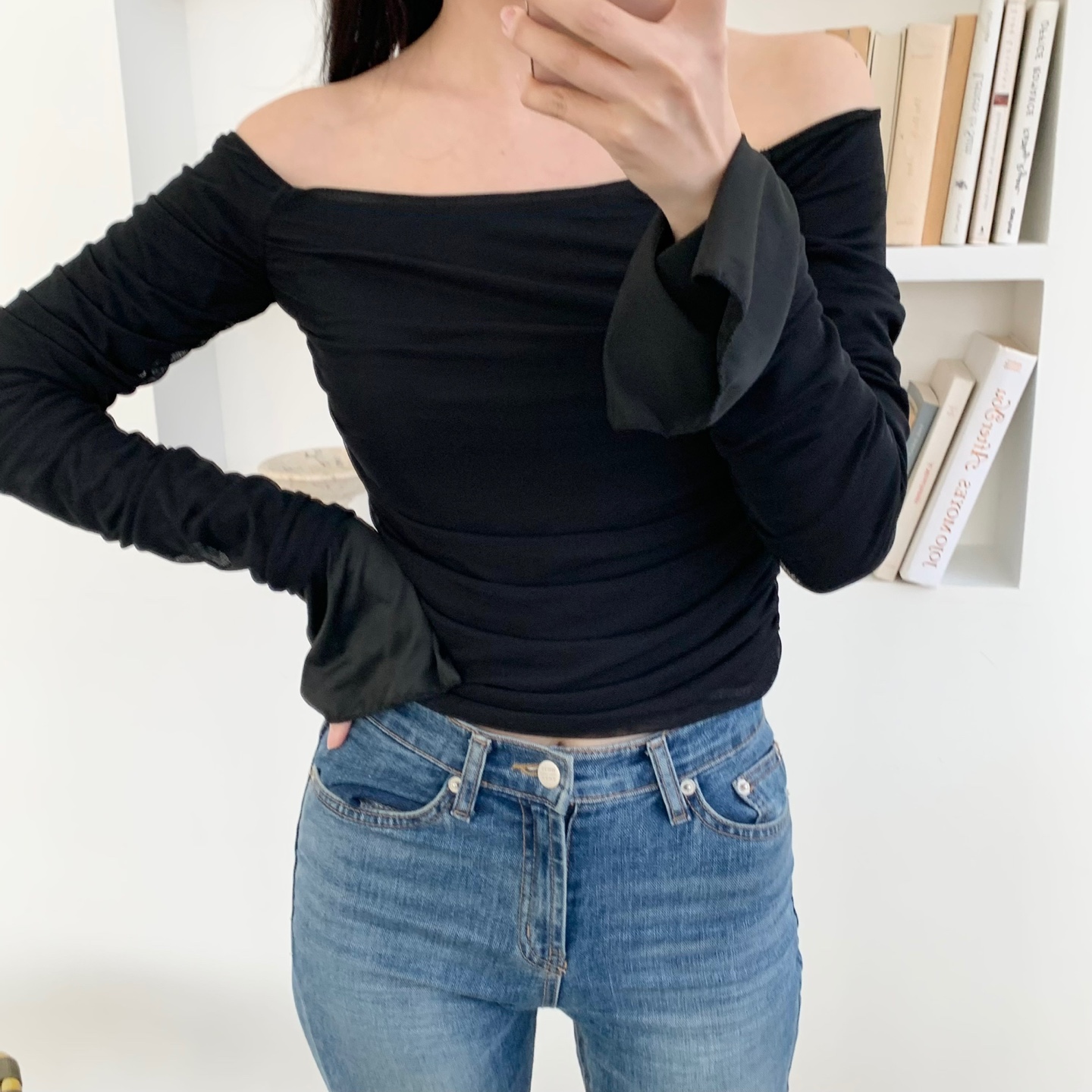 [당일출고] 힌트핀 휴양지룩 오프숄더 크롭티셔츠 봄긴팔티 가을 블랙 레이어드 티셔츠 이너티 수학여행코디